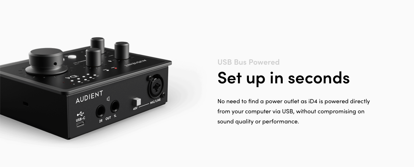 The Audient iD4 MKII is a compact USB-C audio interface designed for professional-grade recording on the go. It features a class-leading Audient mic preamp, a JFET DI input for instruments, and high-performance converters, delivering pristine audio quality. With its simple plug-and-play setup, zero-latency monitoring, and robust build, the iD4 MKII is perfect for musicians, podcasters, and home studio enthusiasts seeking a reliable and portable solution.